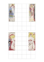 Pour les manches et pans du manteau – une feuille de chaque côté, peut-être plus courte pour marquer les manches, avec un dessin d’Aloïse sur chaque côté (un dessin du cahier « Le premier amour de Franz Schubert »). Taille de chaque pan : 1.8 m par 4 à 6 m. Les images sur les manches sont des projections et non pas des impressions. Elles sont choisies en fonction de chaque acte et présentent des dessins d’Aloïse statiques surtout pendant les périodes sans images vidéo.